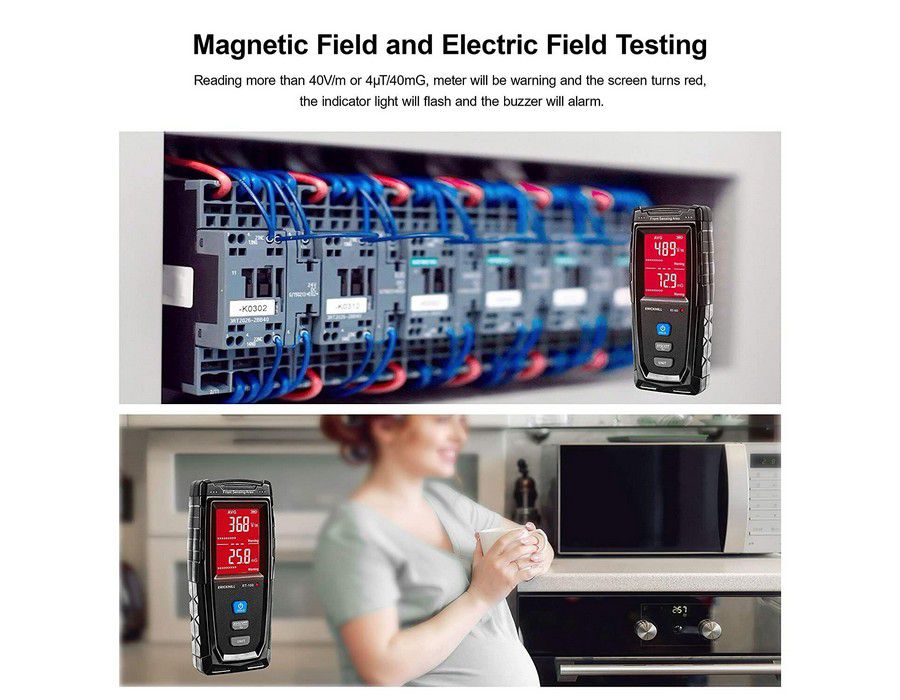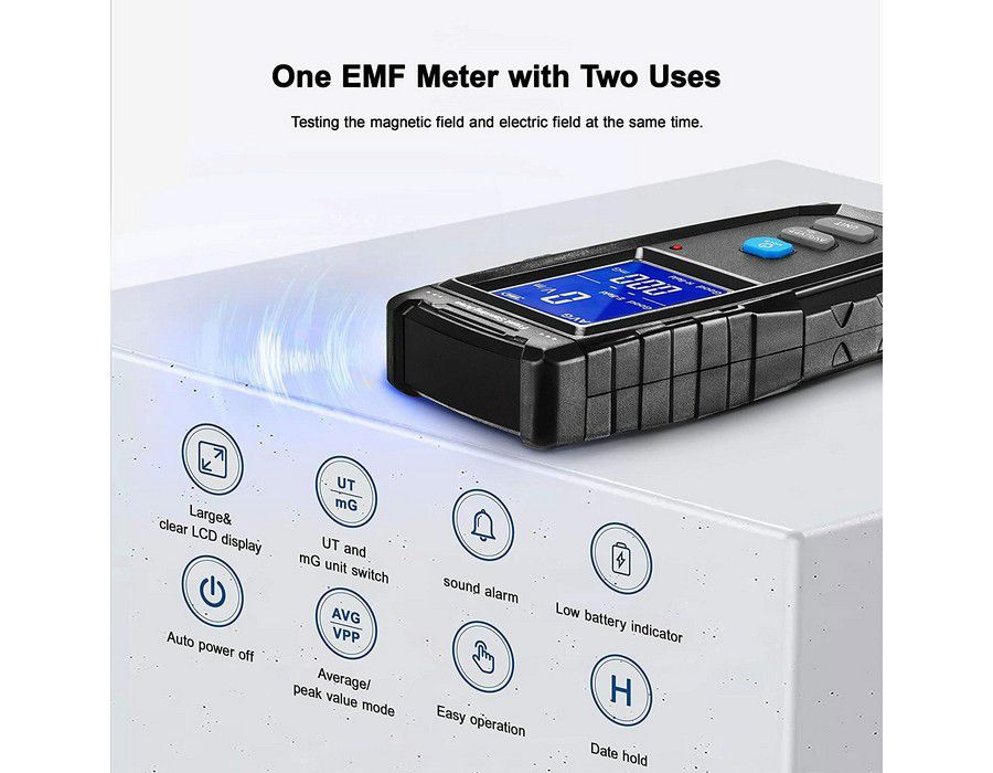 - PRECISE MEASUREMENT: Equipped with a built-in electromagnetic radiation sensor which can display the radiation value on the clear LCD digital display after processing by control micro-chip. Testing magnetic field radiation with optional units mG/T the electric field with unit V/m. This emf meter can not test the RF value.